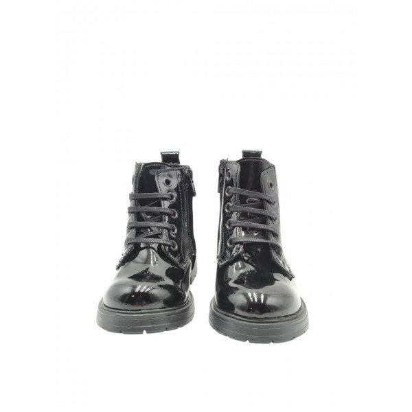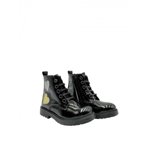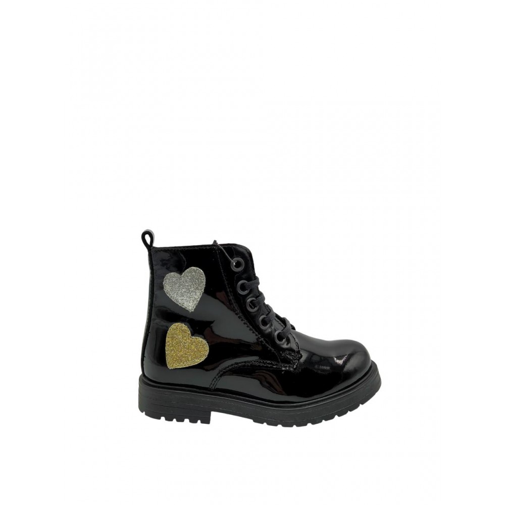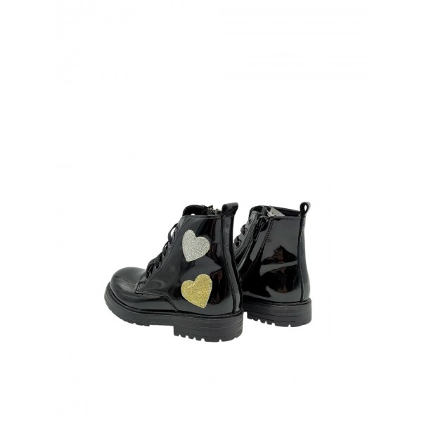 Bota estilo martens, de la marca Yowas. Fabricada en piel charol de primera calidad con diseño de corazones brillantes. Cierre mediante cordones y cremallera en el lateral. Plantilla acolchada. Piso de goma con suela antideslizante.