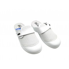 Zueco de señora, de la marca Bio Up. Fabricado en licra perforada y puntera en piel. Con velcro para un mejor ajuste en el empeine.