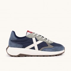 Deportivo casual, de la marca Munich. Fabricado en una combinación de materiales premium que mezcla tejido técnico y ante en tonos azul marino y gris, destacando por su icónica logomarca en blanco y una lengüeta con detalles en rojo. Pisada confortable gracias a su suela de gran volumen y agarre optimizado.