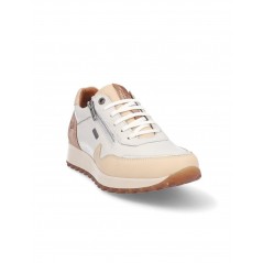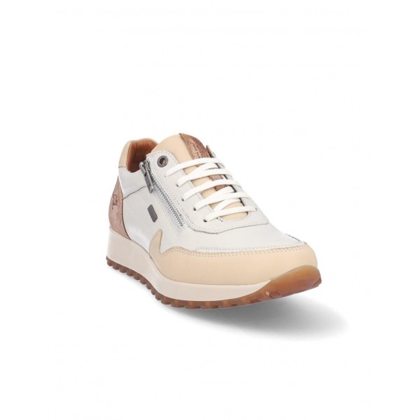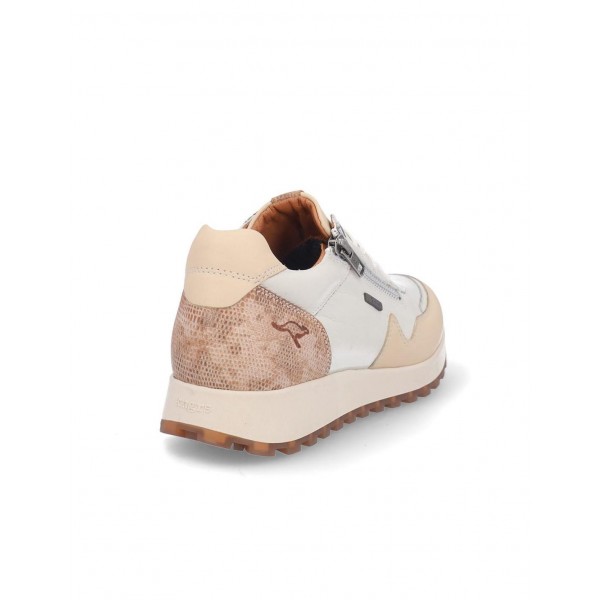 Zapato sport de señora, de la marca Kangaroos. Fabricado en piel color hielo y beige, con membrana resistente al agua y tecnología XDRY. Forro textil con vista de piel. Cierre mediante cordones y cremallera en parte exterior para facilitar el calce. Plantilla textil extraíble termoconformada. Suela de fibra sintética.