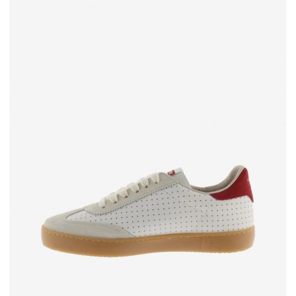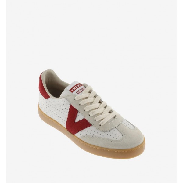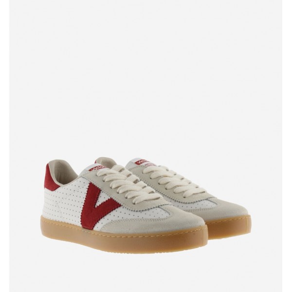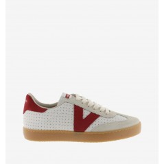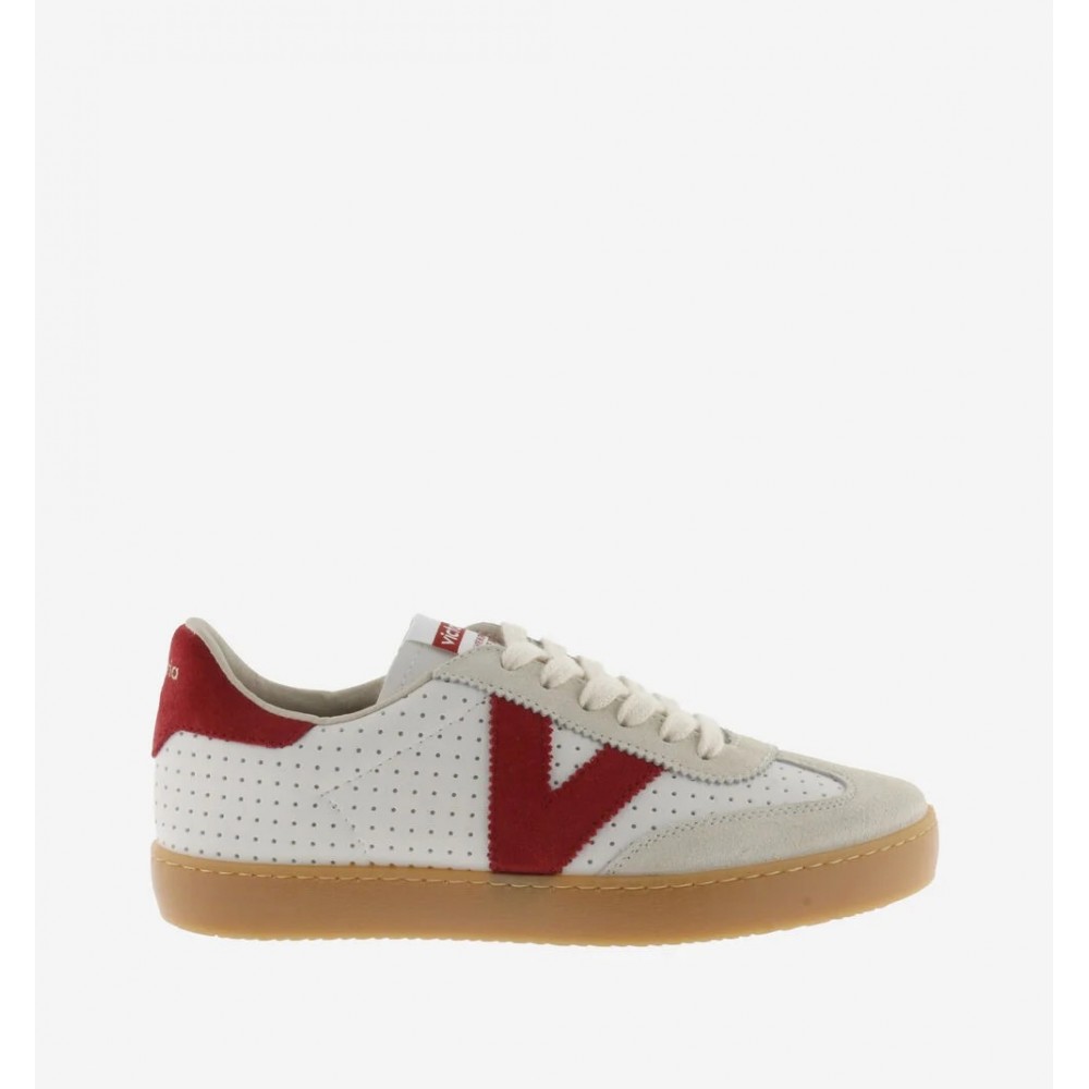 Zapatillas unisex, de la marca Victoria. Fabricadas en efecto piel blanca microperforada con piezas de serraje. V de victoria lateral y pieza trasera en colores a juego en contraste. Suela de T.R. traslúcido color caramelo.