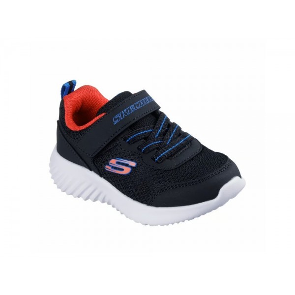 Deportivo infantil, de la marca Skechers. Fabricado en material sintético y malla en la parte superior. Cierre mediante cordones elásticos y velcro. Plantilla cómoda con amortiguación. Media suela ligera con absorción de impactos. Suela flexible con tracción.