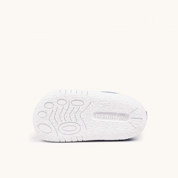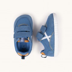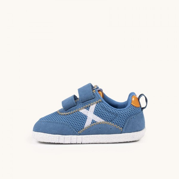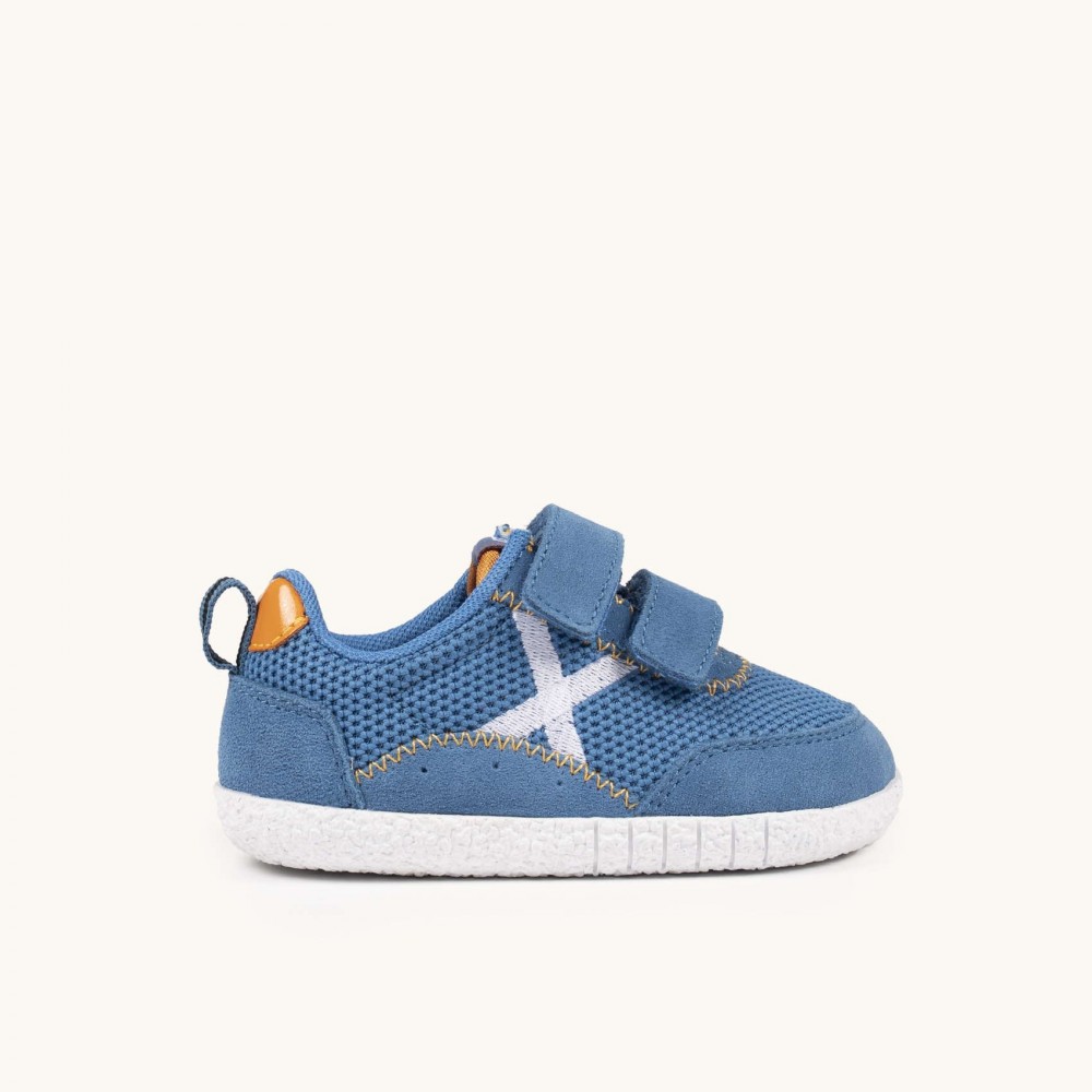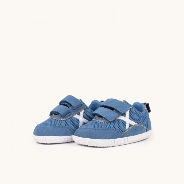Deportivo infantil, de la marca Munich.Presenta un diseño técnico y confortable que combina una malla transpirable en color azul océano con refuerzos de ante suave y costuras decorativas en tono mostaza. Cierre de doble velcro que asegura una sujeción firme y facilita enormemente el calce. Gracias a su suela de goma blanca con relieve antideslizante y su estructura ligera, es la opción ideal para que exploren con seguridad sus primeros juegos en el parque, asistan a la guardería con total comodidad o disfruten de paseos manteniendo siempre un soporte estable y flexible.