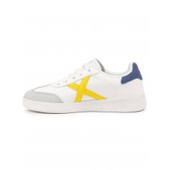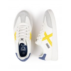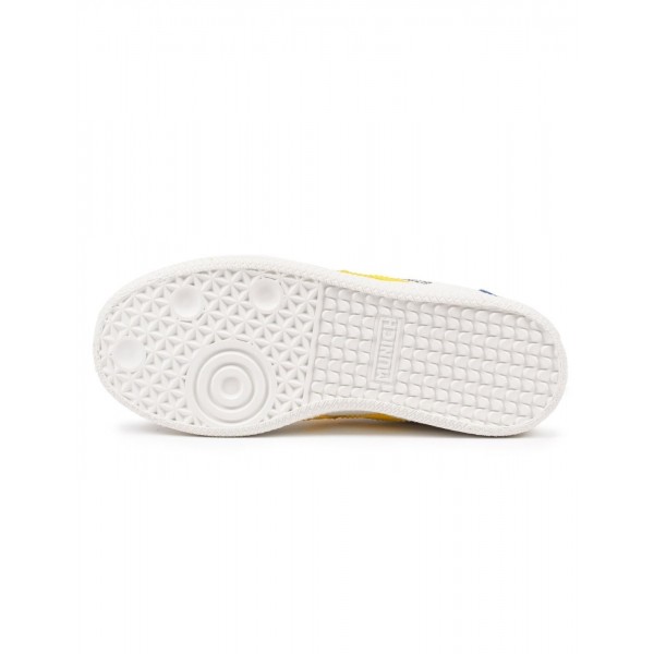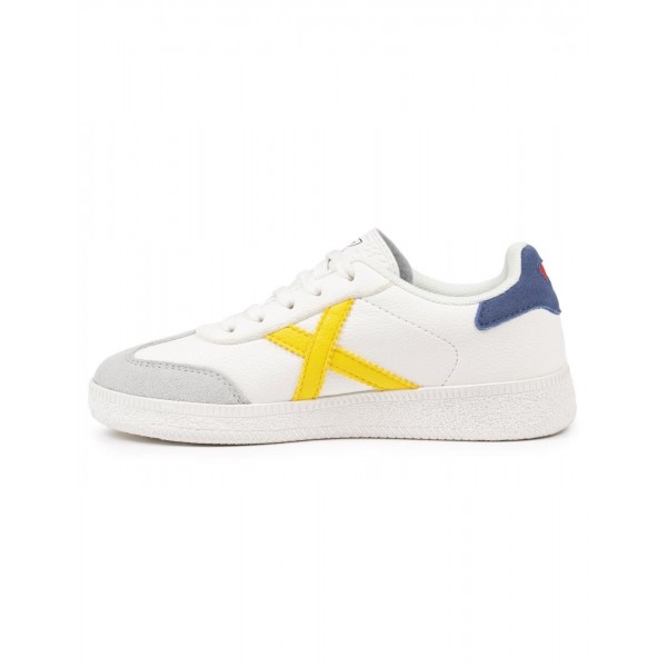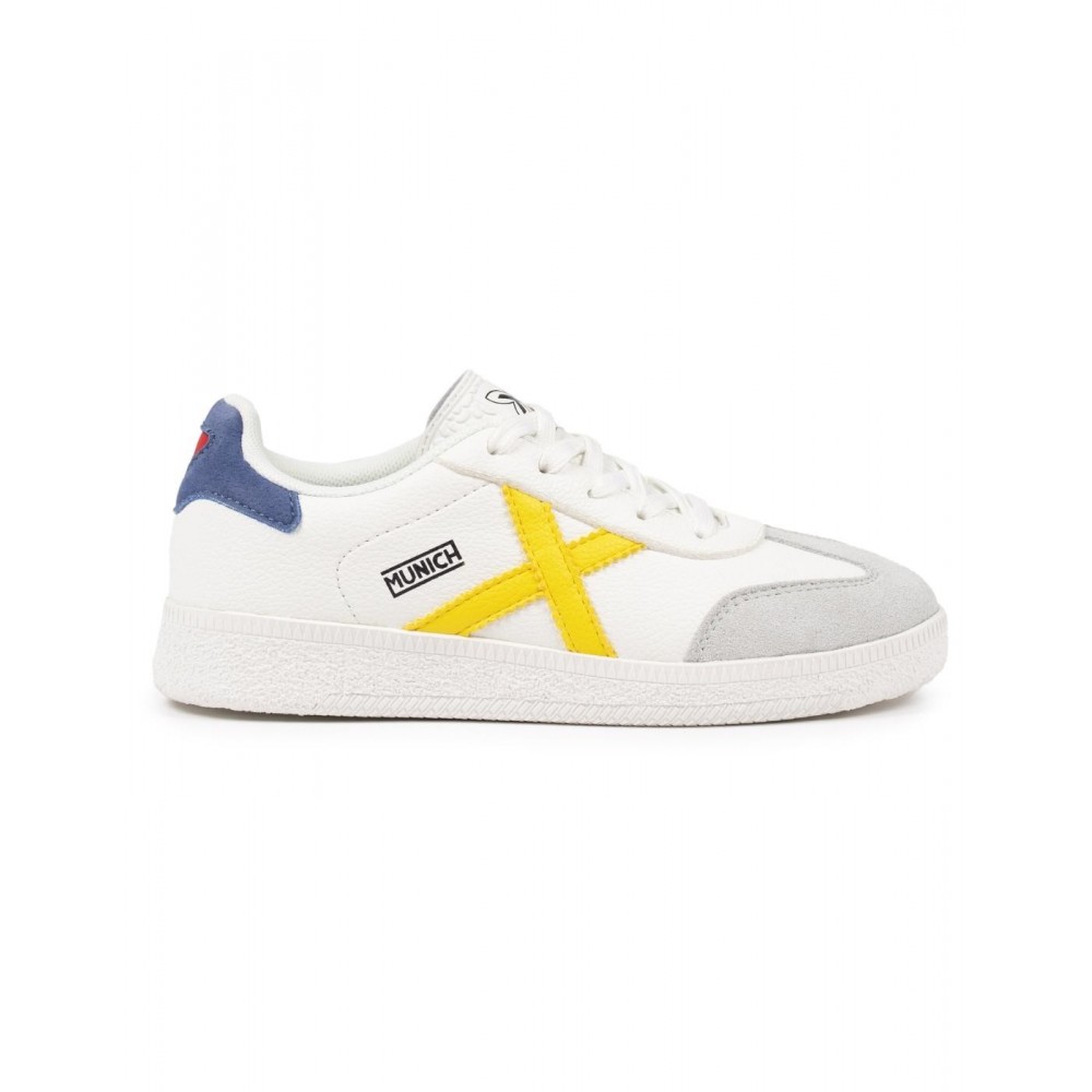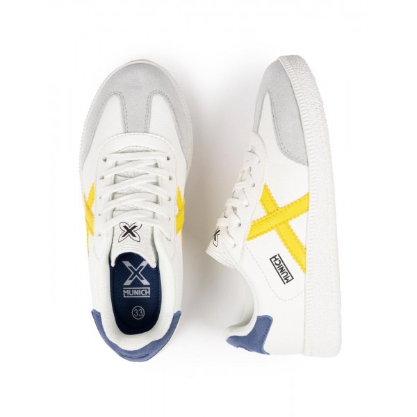 Deportivo infantil, de la marca Munich. Diseño clásico con la X en amarillo y talonera azul. Fabricado en un colorido tono monocromo, combina piel y materiales sintéticos de alta calidad. Puntera reforzada en serraje que garantiza una mayor resistencia al desgaste diario. Cierre mediante cordones. Suela de goma texturizada.
