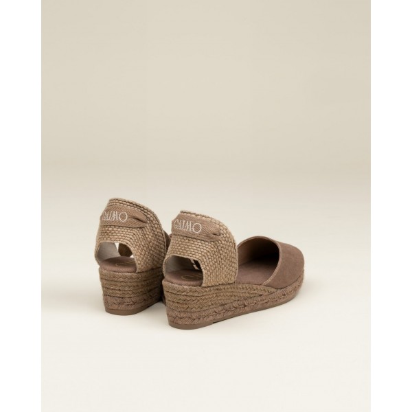 Alpargata de cuña baja, de la marca Gaimo. Diseño cerrado, con escote en forma de corazón y cintas atadas al tobillo, que define una silueta ligera y femenina. Acabada en algodón lavado mediante procesos artesanales, presenta un diseño en un solo tono, limpio y bien proporcionado.