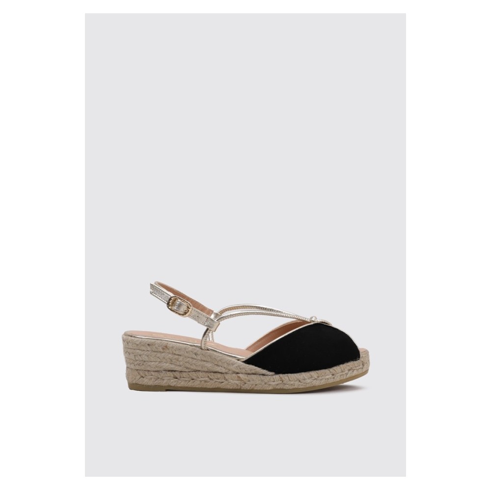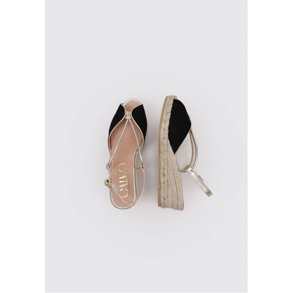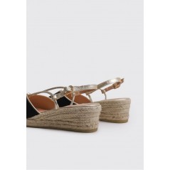 Alpargata de mujer con cuña de yute ecológico, de la marca Gaimo. Fabricada en piel ante.Corte abierto con detalle de tiritas metalizadas y trasera destalonada. Forro y plantillas acolchadas de piel. Cierre mediante hebilla lateral.