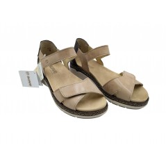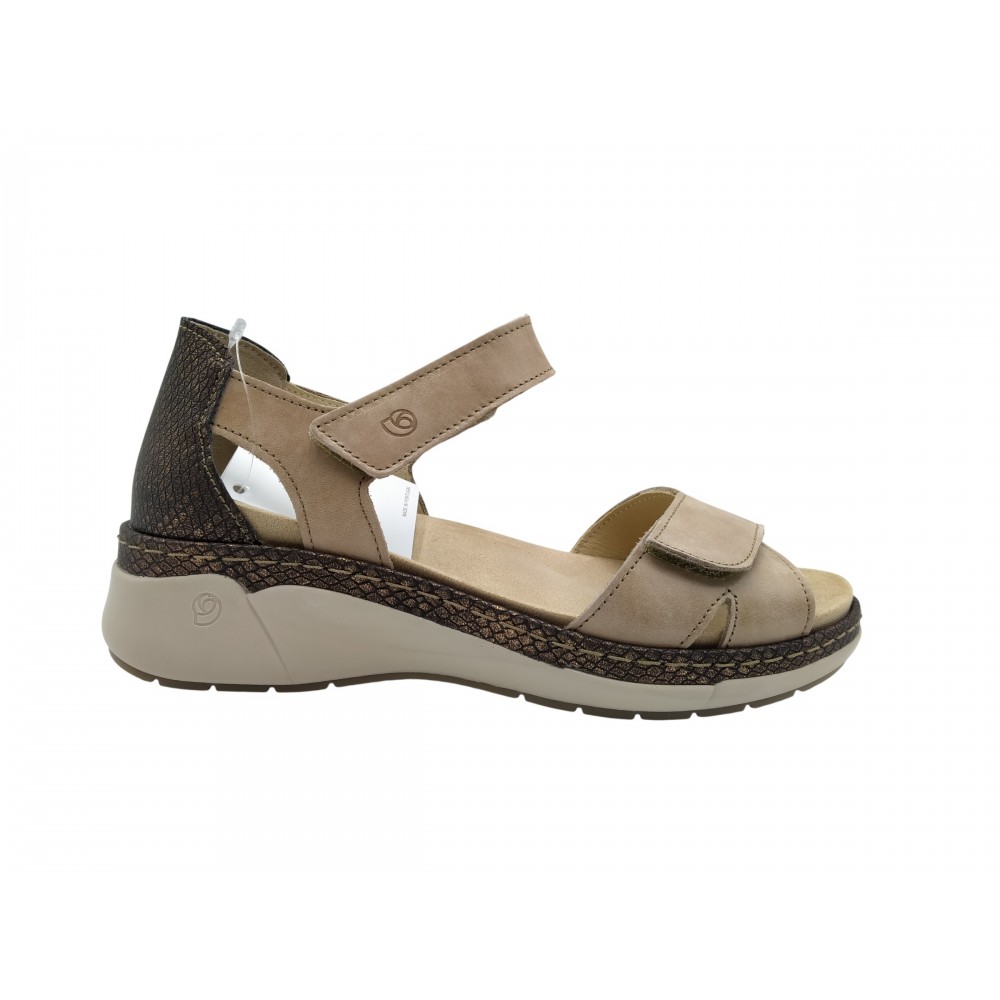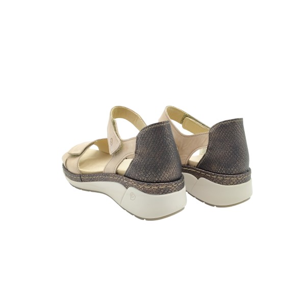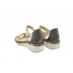Sandalia de cuña, de la marca Suave. Fabricada en piel natural en combinación con piel serpiente. Cierre mediante doble velcro en el tobillo y empeine. Plantilla extraíble, anatómica y lavable en piel. Piso Azores con una altura aproximada de 4'5 cms.