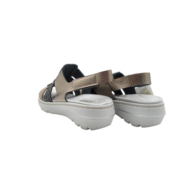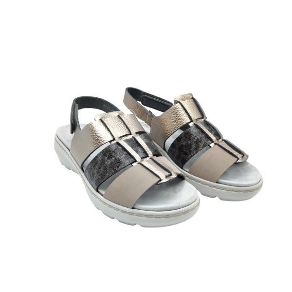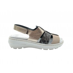 Sandalia de cuña, de la marca Suave. Fabricada en combinación de piel natural, metalizada y print. Cierre mediante velcro. Plantilla extraíble, anatómica y lavable en piel. Piso Krabi con una altura aproximada de 4,5 cms.