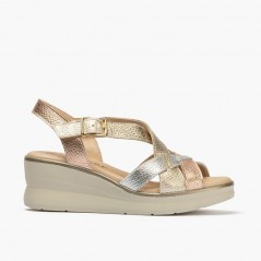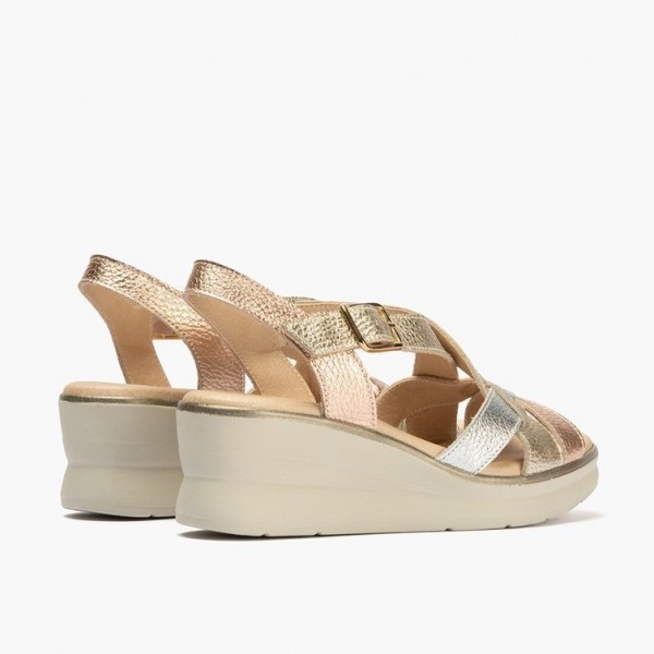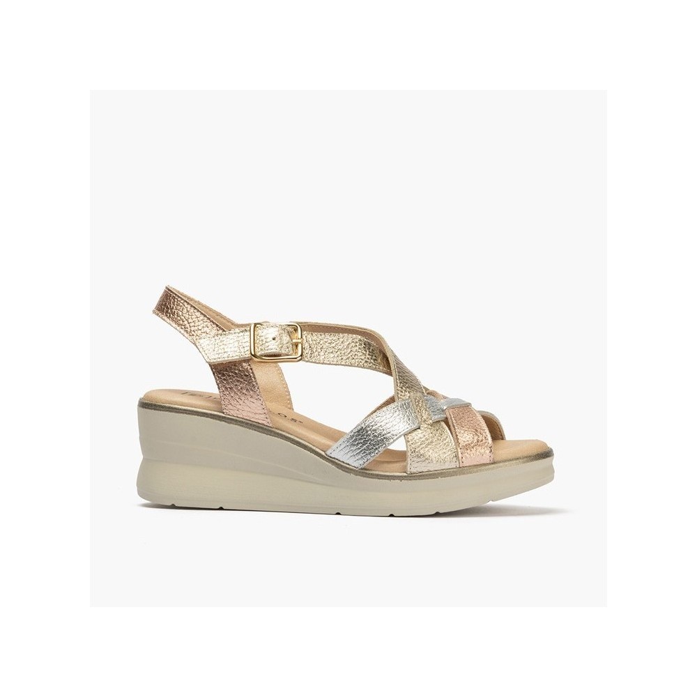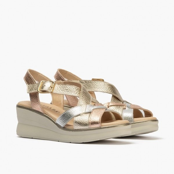 Sandalia con cuña, de la marca Pitillos. Fabricada en piel napa bombeada y piel napa laminada con tiras entrelazadas. Cierre mediante hebilla lateral. Plantilla acolchada no extraíble. Piso de poliuretano.