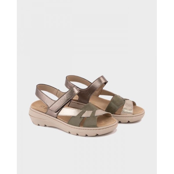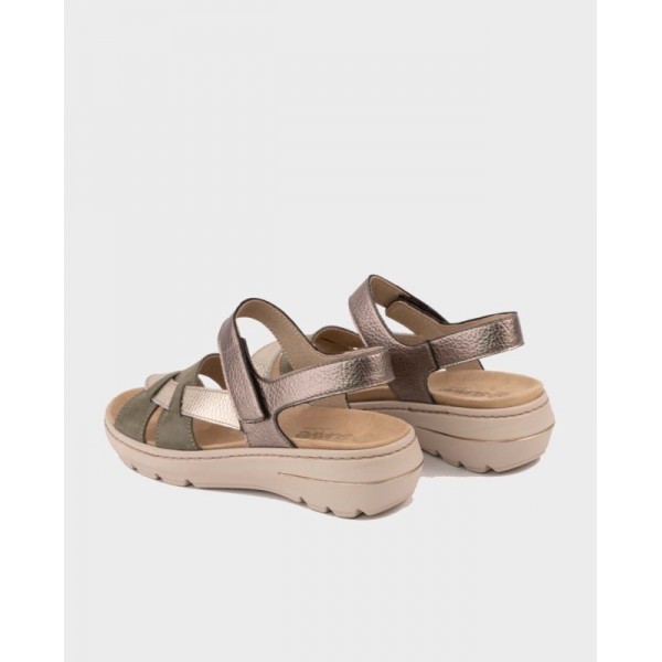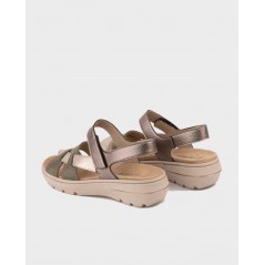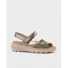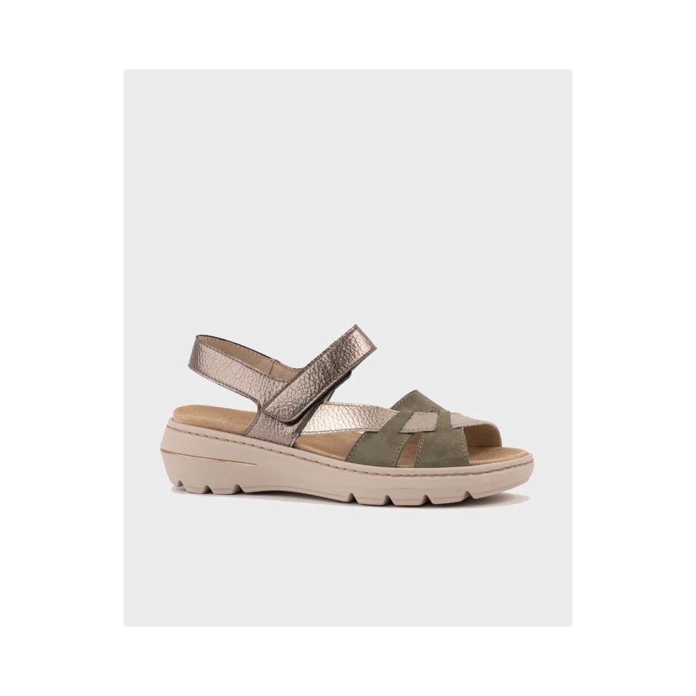 Sandalia de cuña, de la marca Suave. Fabricada en piel natural. Cierre mediante velcro. Plantilla extraíble, anatómica y lavable en piel. Piso Krabi con una altura aproximada de 4,5 cms.