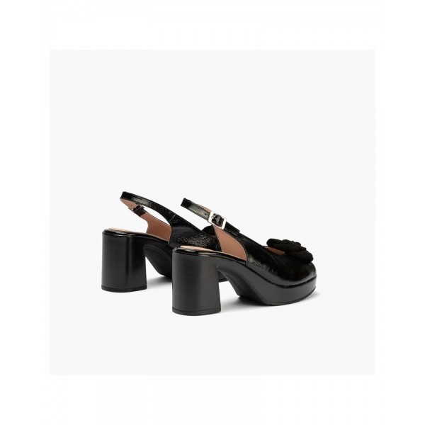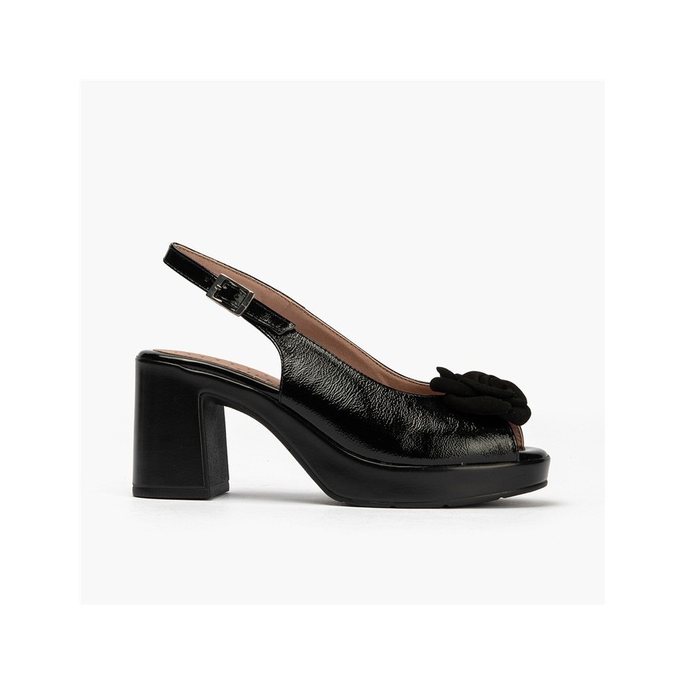 Sandalia con tacón y plataforma, de la marca Pitillos. Faricada en piel charol, destalonada con adorno de flor en piel ante. Forro interior textil. Cierre mediante hebilla. Plantilla textil. Piso de poliuretano.