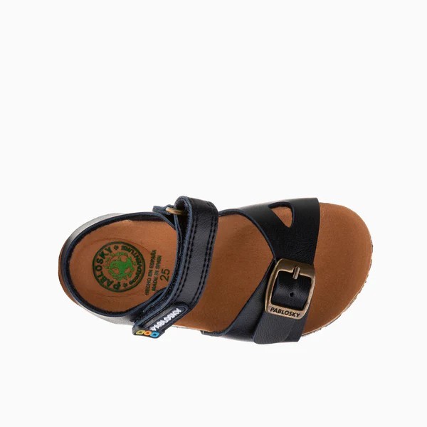 Sandalia bio infantil, de la marca Pablosky. Fabricada con materiales reciclados con el mínimo impacto ambiental. Forro textil transpirable. Plantilla fisiológica de corcho, flexible y absorbente para el auténtico confort. Se abrocha muy fácilmente con cierre adherente, garantizando la correcta sujeción de cualquier pie. Piso de goma antideslizante.