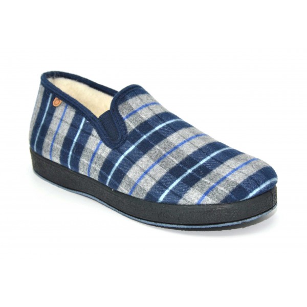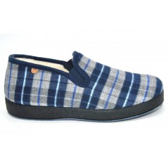 Zapatilla de casa cerrada para caballero, de la marca La Cadena. Fabricadas con paño de cuadros y forro interior de pura lana. Elásticos laterales. Piso grueso de goma antideslizante que aísla del frío.