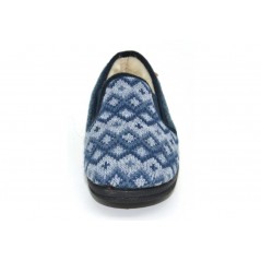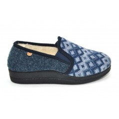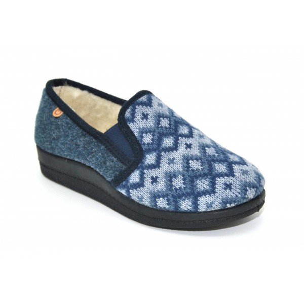 Zapatilla de casa cerrada, de la marca La Cadena. Fabricada en textil combinado de paño y punto con forro interior de pura lana. Elásticos laterales. Piso de goma antideslizante.