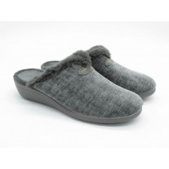 Zapatilla de casa descalza con cuña, de la marca CM Confort. Fabricada en tejido suapel muy calentito con ribete de pelo. Piso de goma antideslizante.