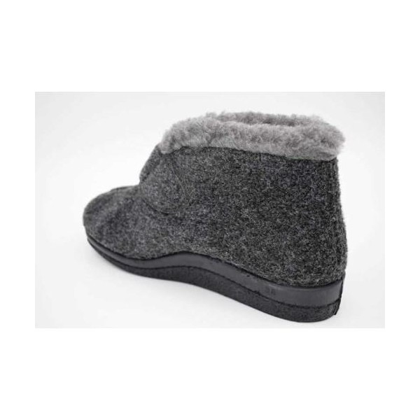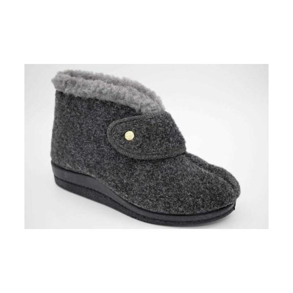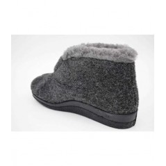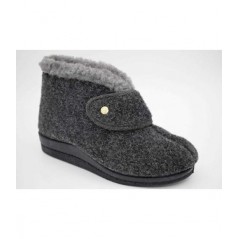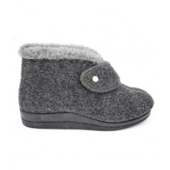 Zapatilla de casa tipo bota para mujer, de la marca La Cadena. Fabricada con material textil y forro de lana natural virgen. Cierre mediante velcro. Piso de goma antideslizante.