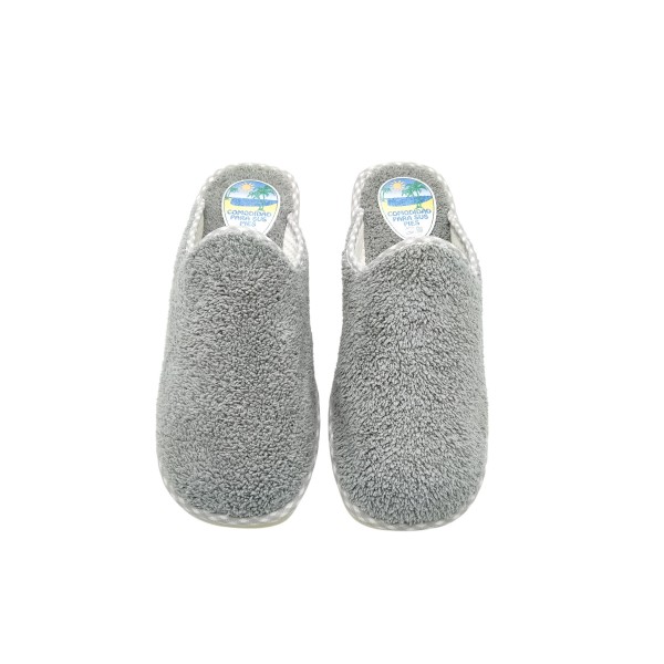 Zapatilla de casa descalza con cuña, de la marca Berevëre. Fabricada en rizo de bambú, que aporta gran transpirabilidad al pie y cuenta con una buena absorción de la humedad. Ribete de cuadritos. Plantilla de tacto suave ligeramente acolchada. Piso microporoso.