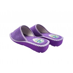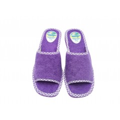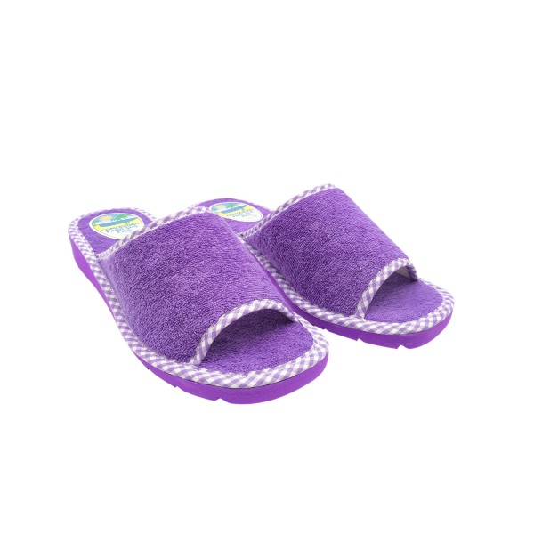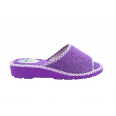 Zapatilla de casa descalzacon cuña, de la marca Berevëre. Fabricada en rizo. Ribete de cuadritos. Puntera abierta. Plantilla de tacto suave ligeramente acolchada. Piso microporoso.