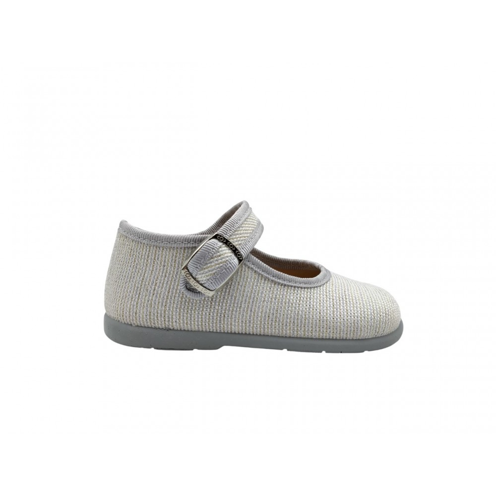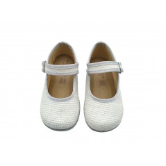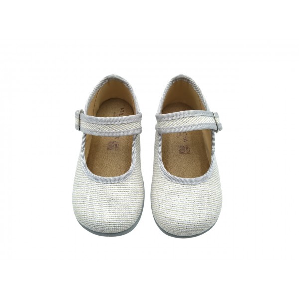 Zapatilla merceditas infantil, de la marca Vulca Bicha. Fabricada en material textil. Cierre mediante tira con broche lateral. Plantilla textil. Piso de goma antideslizante.