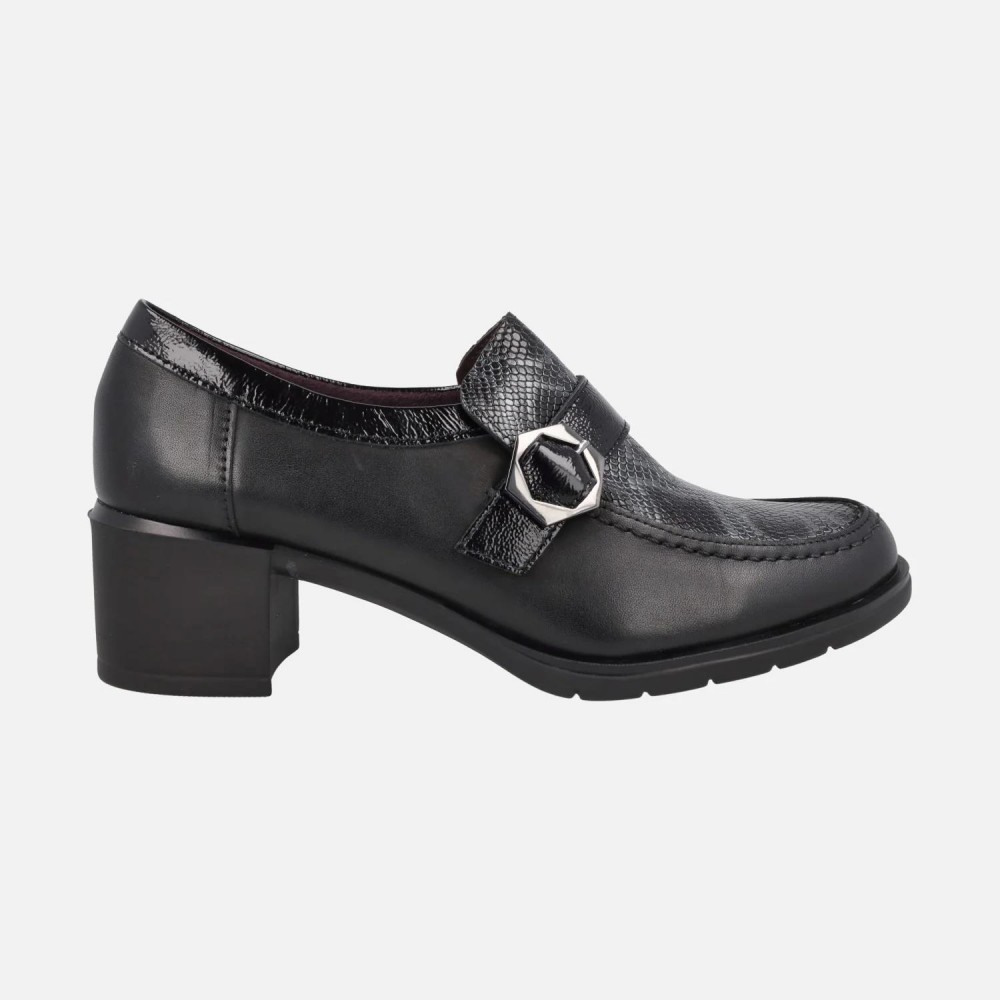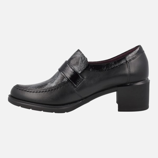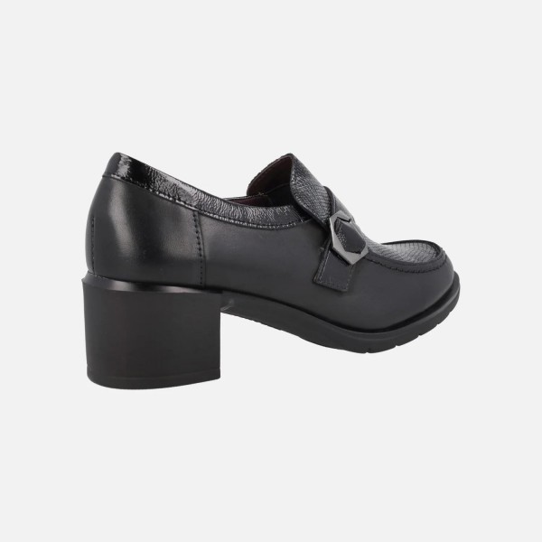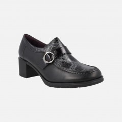 Mocasín de tacón, de la marca Pitillos. Fabricado en piel napa con piel grabada en el empeine y hebilla. Forro interior textil. Piso sintético antideslizante.
