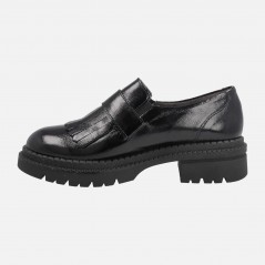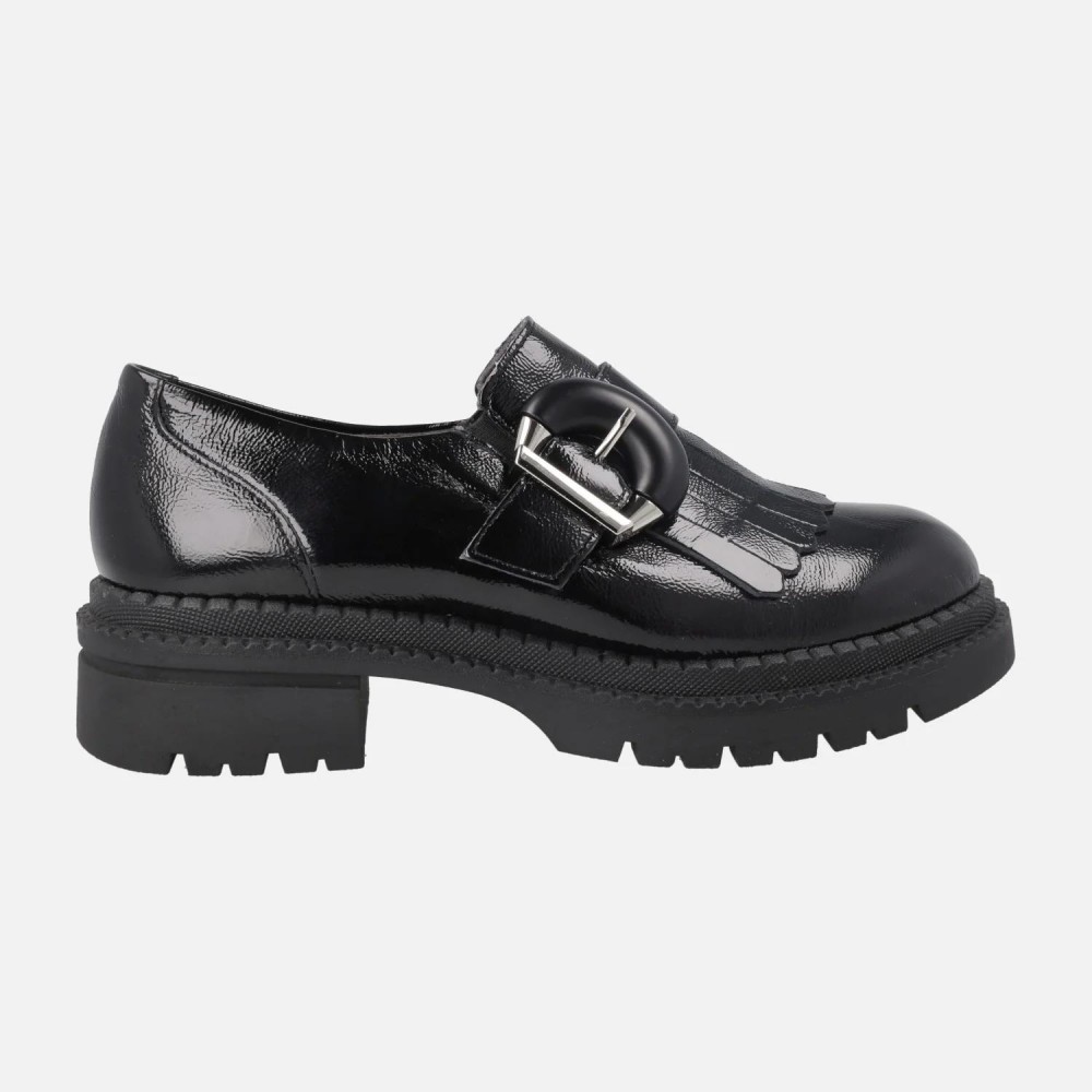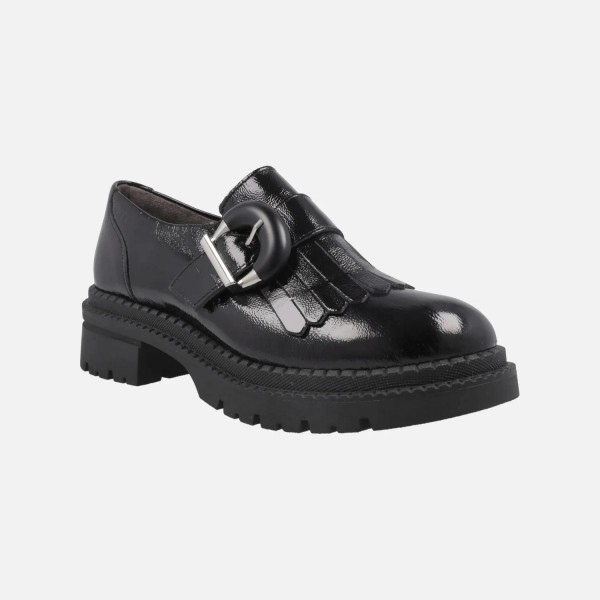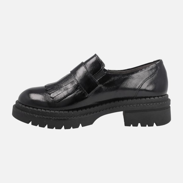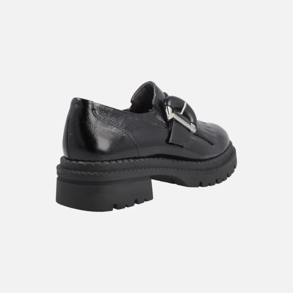 Zapato mocasín, de la marca Pitillos. Confeccionado en piel charol con detalle de hebilla y flecos en el empeine. Forro interior textil. Elásticos laterales para un mayor ajuste al pie. Plantilla extraíble. Piso de goma antideslizante.